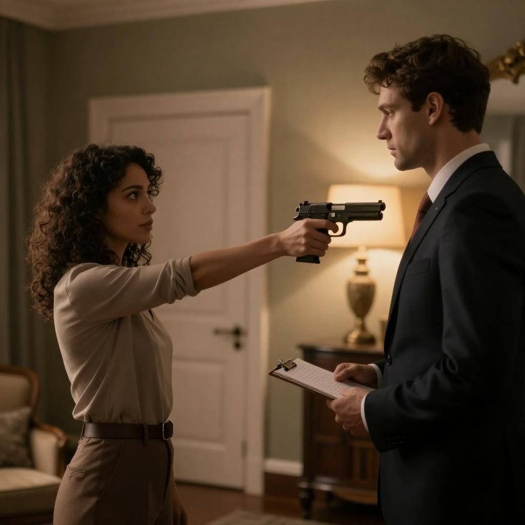 Photograph of a tense scene: a woman with curly dark hair, wearing a beige long-sleeve top, points a handgun at a man in a dark suit holding a notepad. They stand in a dimly lit, elegant room with warm lighting, a door, and furniture in the background.