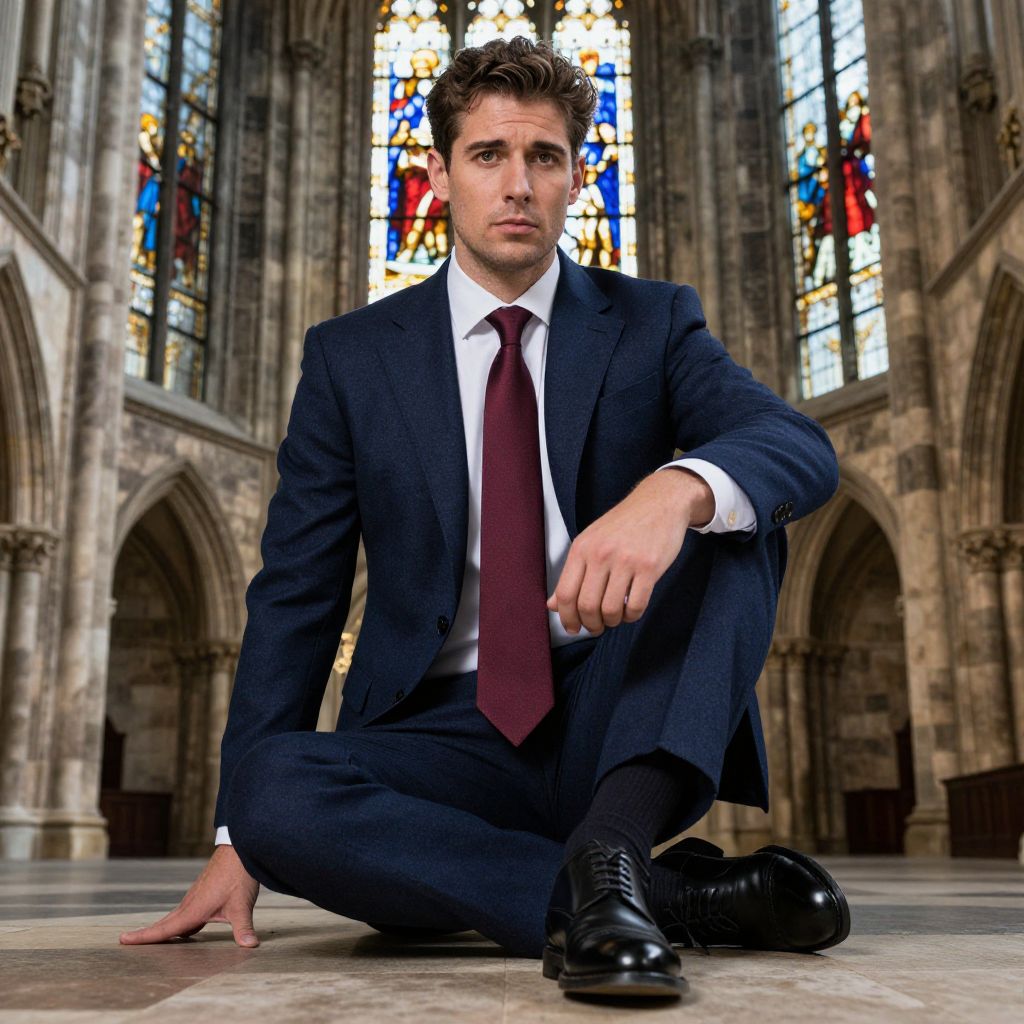 A man, navy wool suit, crisp white dress shirt, deep burgundy silk tie, polished black leather oxford shoes, majestic cathedral spires, stained glass windows, camera obscura style, contemplative expression Man has masculine face and piercing eyes