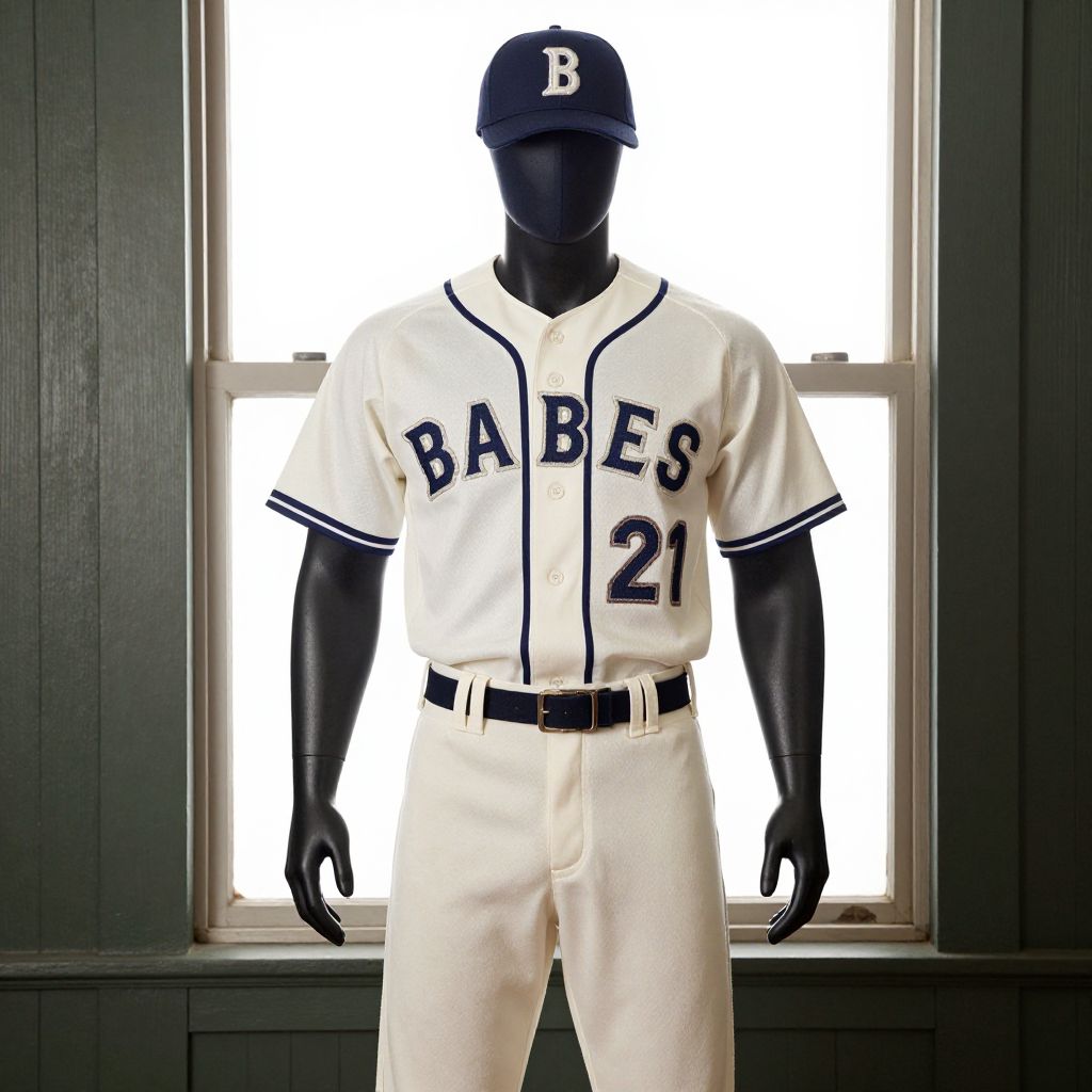 Mannequin dressed in a vintage baseball uniform with 'BABES' and number 21 on the jersey. The uniform includes a cream-colored jersey and pants with navy blue piping and a matching navy blue belt and cap featuring the letter 'B'. The figure stands in front of a window with wooden paneling in the background.