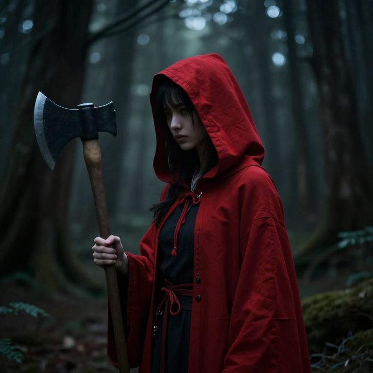 Photograph of a young woman standing in a dark, misty forest. She wears a bright red hooded cloak with the hood up, partially covering her long, dark hair. Her serious expression is visible under the hood. She holds a large, double-bladed axe with a wooden handle in her right hand. The cloak is slightly worn and has a dark brown inner layer tied with a red string. The background is blurred, showing tall, dense trees with dark trunks and a misty atmosphere, creating a mysterious, eerie forest setting. The lighting is dim, with a cool blue tint.