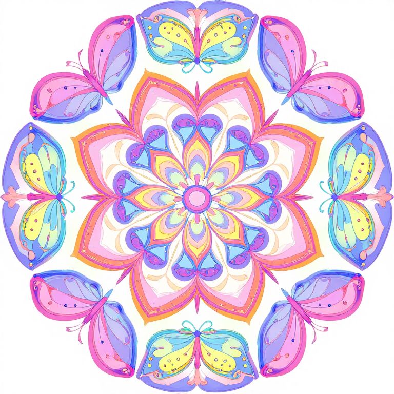 A vibrant, symmetrical digital mandala featuring a butterfly pattern with repetitive, bright pastel colors.