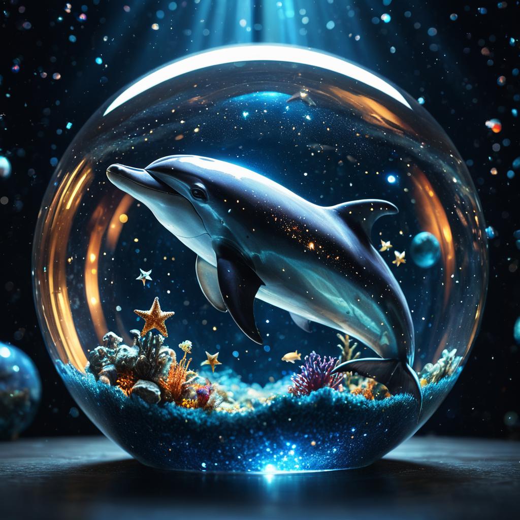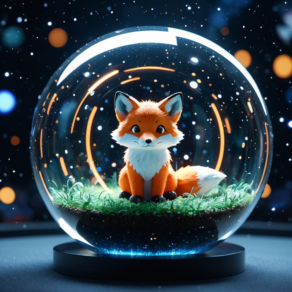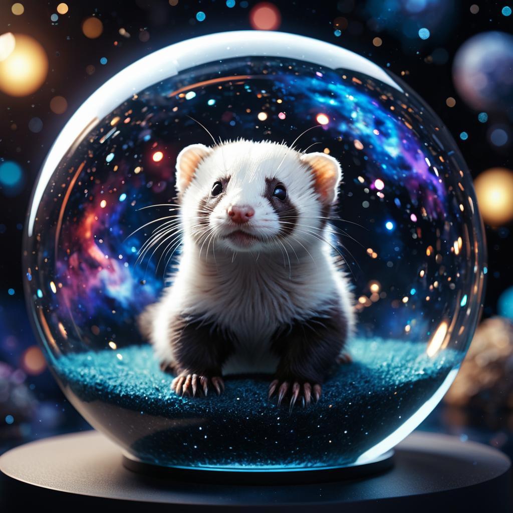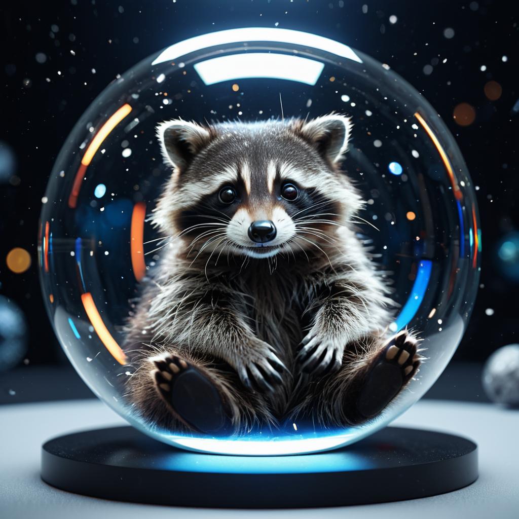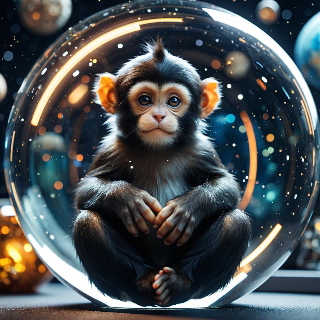 Medium close-up shot of a very cute void helper monkey sitting inside a giant glass sphere floating through space, concept art by M.W. Kaluta, volumetric lighting, rich colors, humorous, realistic reflections, smooth depth perception, tilt-shift effect, 4K, Unreal Engine 5