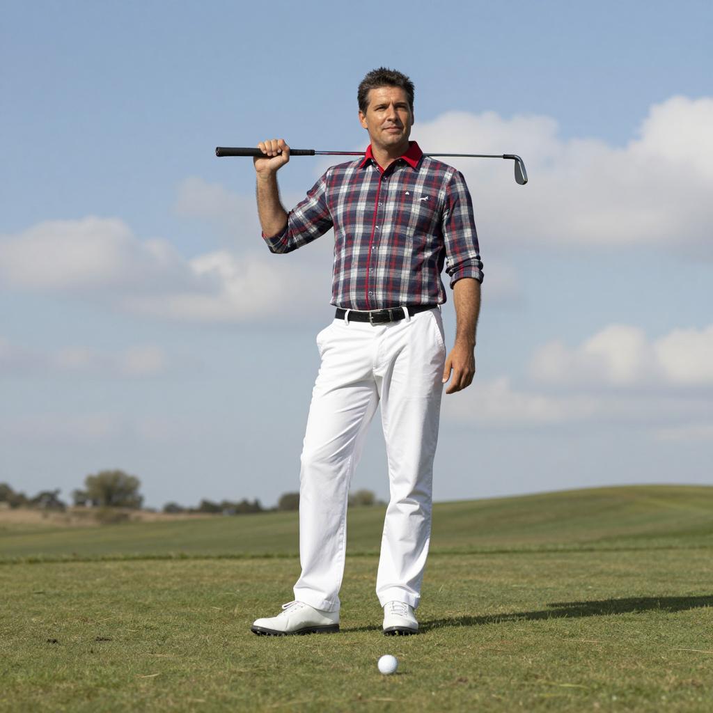 Man standing on grassy field, holding golf club over right shoulder, wearing plaid shirt with red accents, white pants. Blue sky with white clouds background. Golf ball in foreground. Man has short dark hair, relaxed expression. Realistic photograph.