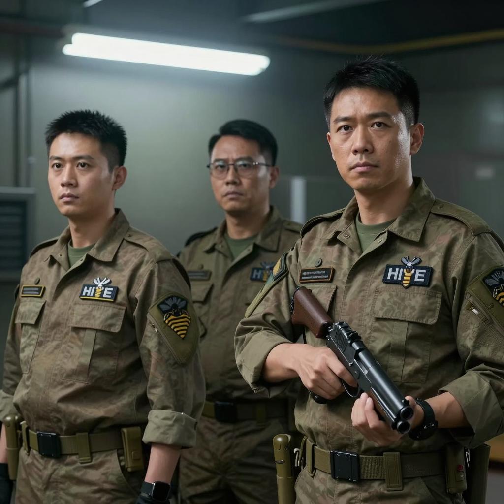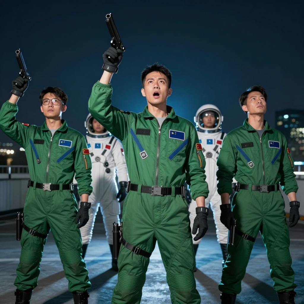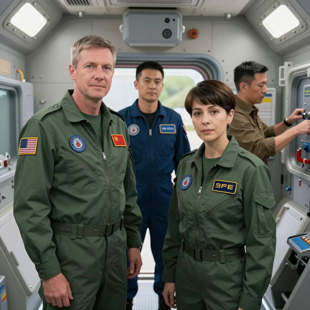 Four people in a spaceship interior. Two men in green military jackets with patches, one with a red emblem, standing left and center. One man in a dark blue jumpsuit with a badge, standing behind them. One woman in a green military jacket with a badge, standing front right. Background includes metallic walls, equipment, and a window showing greenery. Second man in brown shirt, standing right, reaching for equipment. All looking slightly to the left.