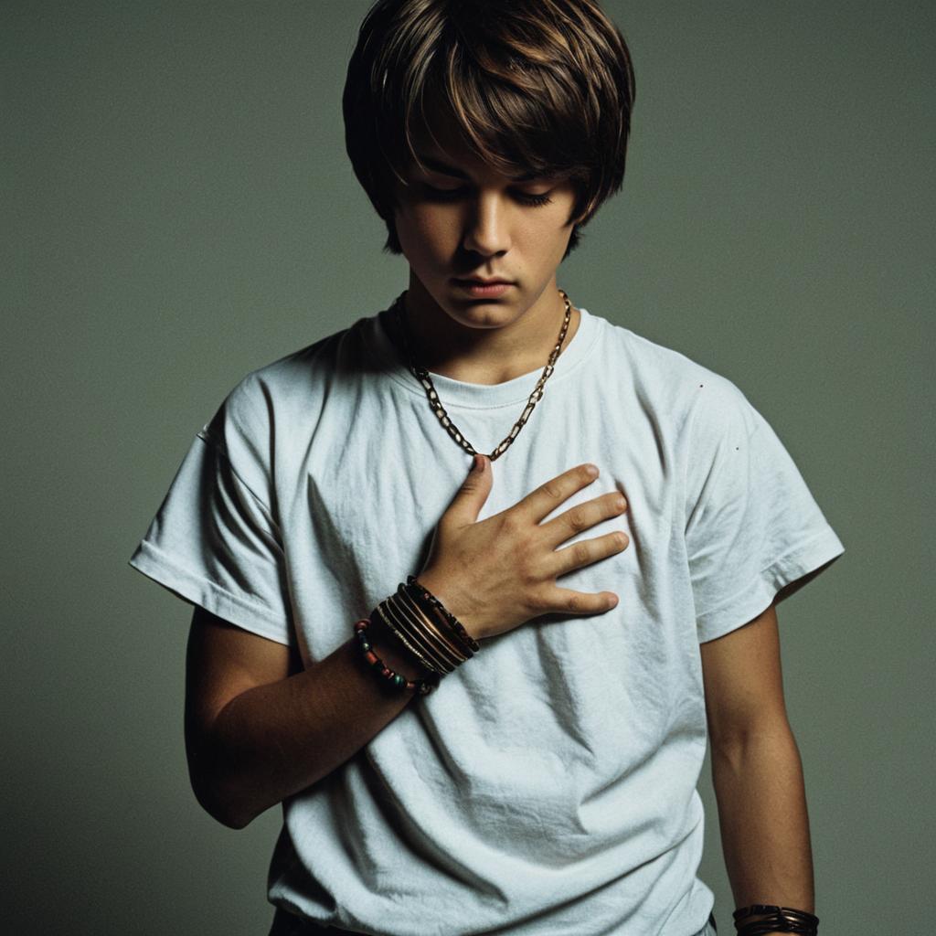 Fear god costume,1boy, male focus, solo, realistic, standing, shirt, scar, brown hair, bracelet, short hair, closed mouth
