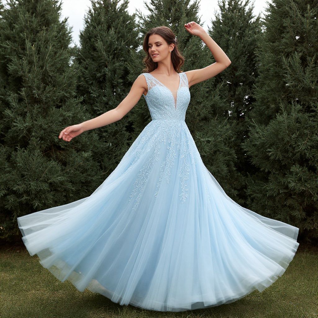Elegant woman twirling gracefully in a baby blue gown from Digio Bridal, featuring an airy tulle skirt and intricate lace detailing, surrounded by tall evergreen trees in a serene outdoor setting.