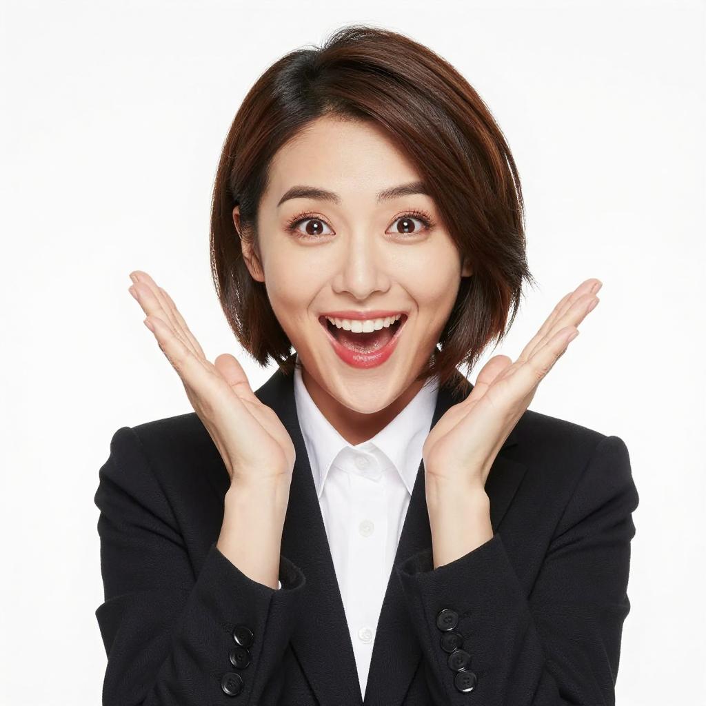 Photograph of a woman with short, dark brown hair and fair skin, wearing a black blazer over a white shirt. She's smiling widely with her red lips, eyes wide open, and hands raised beside her face in a surprised or excited gesture. The background is completely white, making her the focal point. Her expression is lively and energetic.