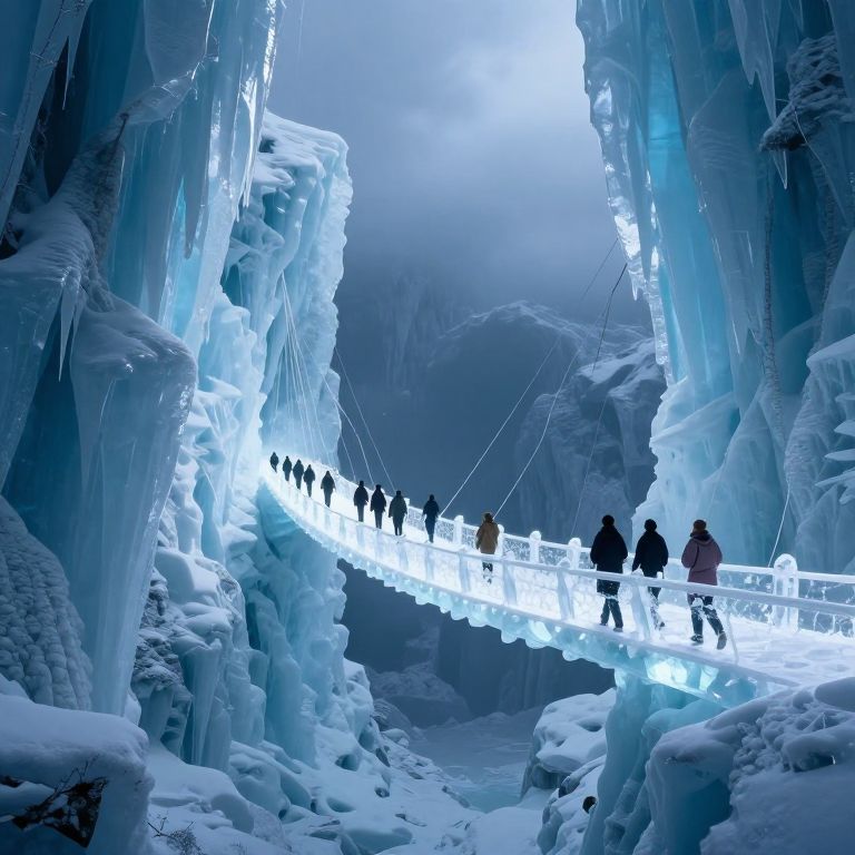 Photograph of a glowing, icy suspension bridge surrounded by towering, crystalline blue ice formations, with silhouetted people walking across.