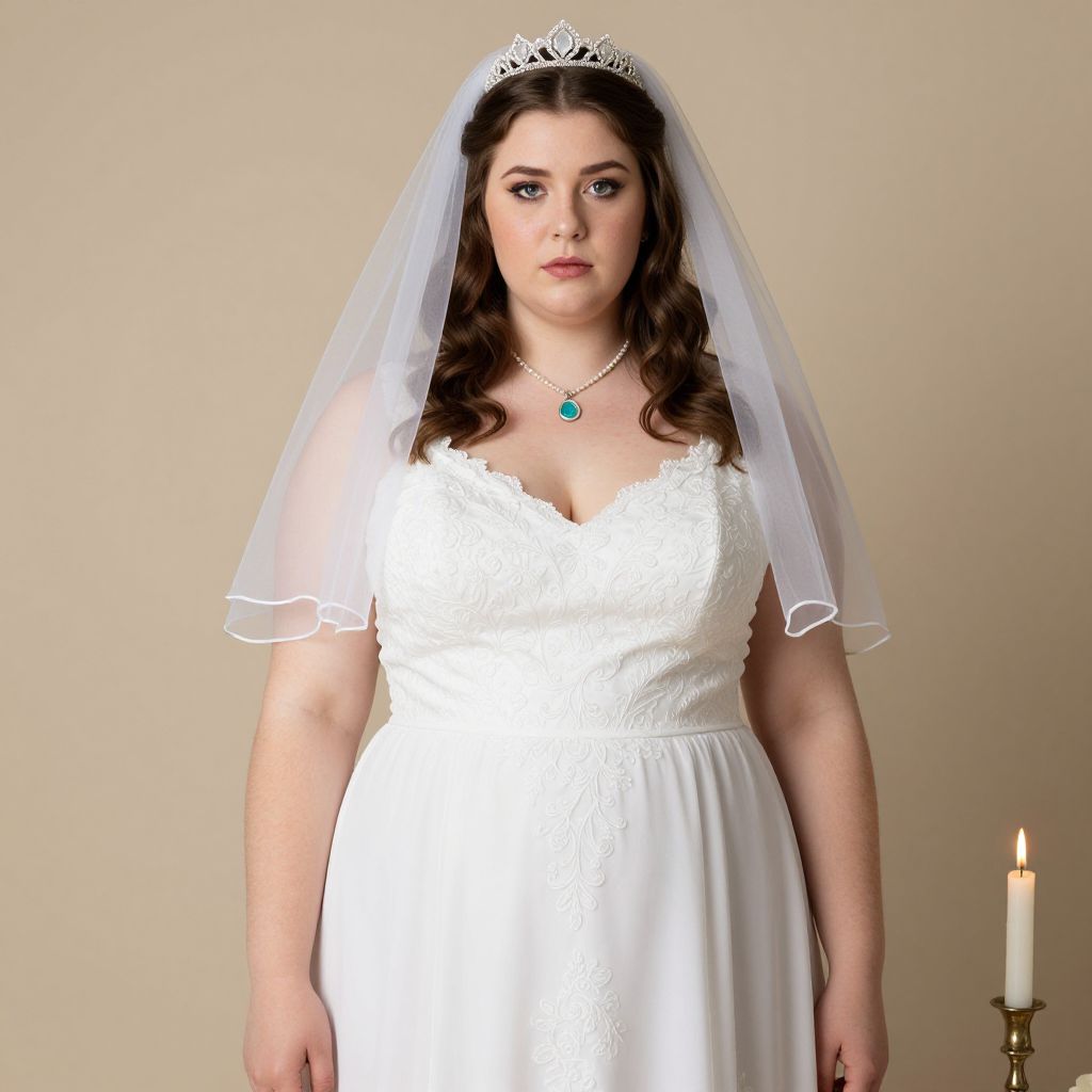 Photograph of a plus-sized white woman with fair skin and long, wavy brown hair, wearing a white lace wedding dress with a deep V-neck and a sheer white veil adorned with a silver tiara. She has a serious expression, with light makeup and a green gemstone necklace. The background is a plain, beige wall, and there is a single lit candle in a brass holder on the right. The image focuses on her from the waist up, emphasizing her bridal attire and full figure. The overall style is simple and elegant.