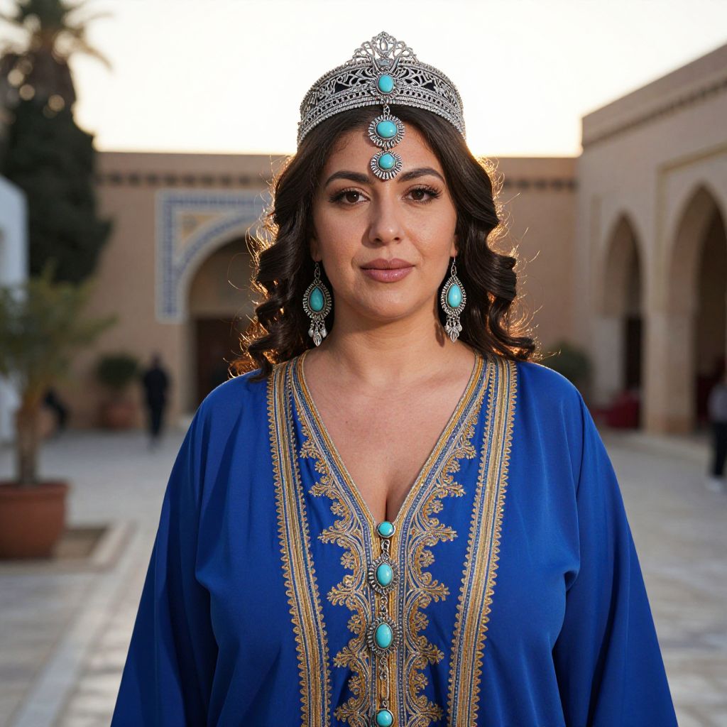 A detailed shot of a Tunisian woman in a traditional costume featuring a layered headpiece with handcrafted silver filigree and dangling turquoise pendants, wearing a flowing indigo robe with embroidered patterns, standing in an old medina courtyard in Hammamet, Tunisia, under a golden hour sky; her face is softly illuminated, with dark wavy hair neatly pulled back, and her expression shows pride and heritage. The woman has big tits and cute face