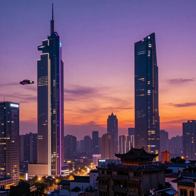Photograph of a vibrant cityscape at dusk featuring modern skyscrapers illuminated with purple and blue lights. Two tall, sleek towers dominate the center, with a third slightly shorter tower to the right. The sky transitions from deep purple to orange near the horizon. A UFO-like drone hovers in the upper left. Traditional Asian-style buildings with tiled roofs are visible in the foreground. Streetlights below cast a warm yellow glow, contrasting with the cool urban lights. The overall scene blends futuristic architecture with traditional elements, set against a colorful, twilight sky.