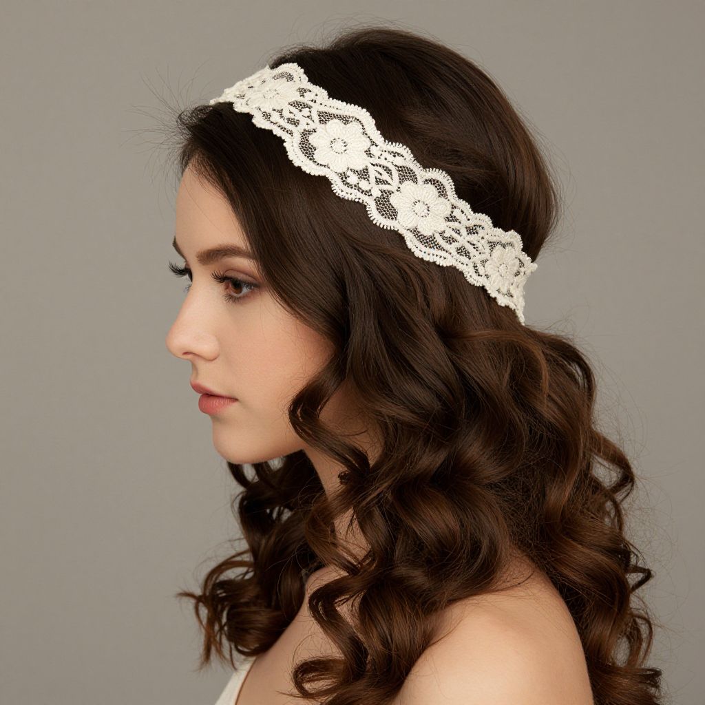 Elegant lace headband adorns a woman's styled hair, complementing her bohemian-inspired look with intricate floral patterns and soft curls cascading down her shoulders.