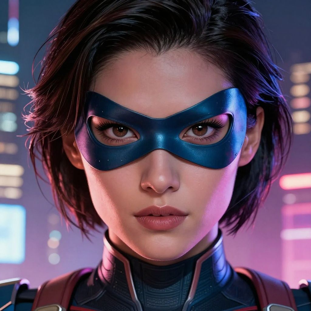 Digital art of a fierce, young woman with short black hair, wearing a blue mask and black suit, illuminated by city lights. Intense gaze,
