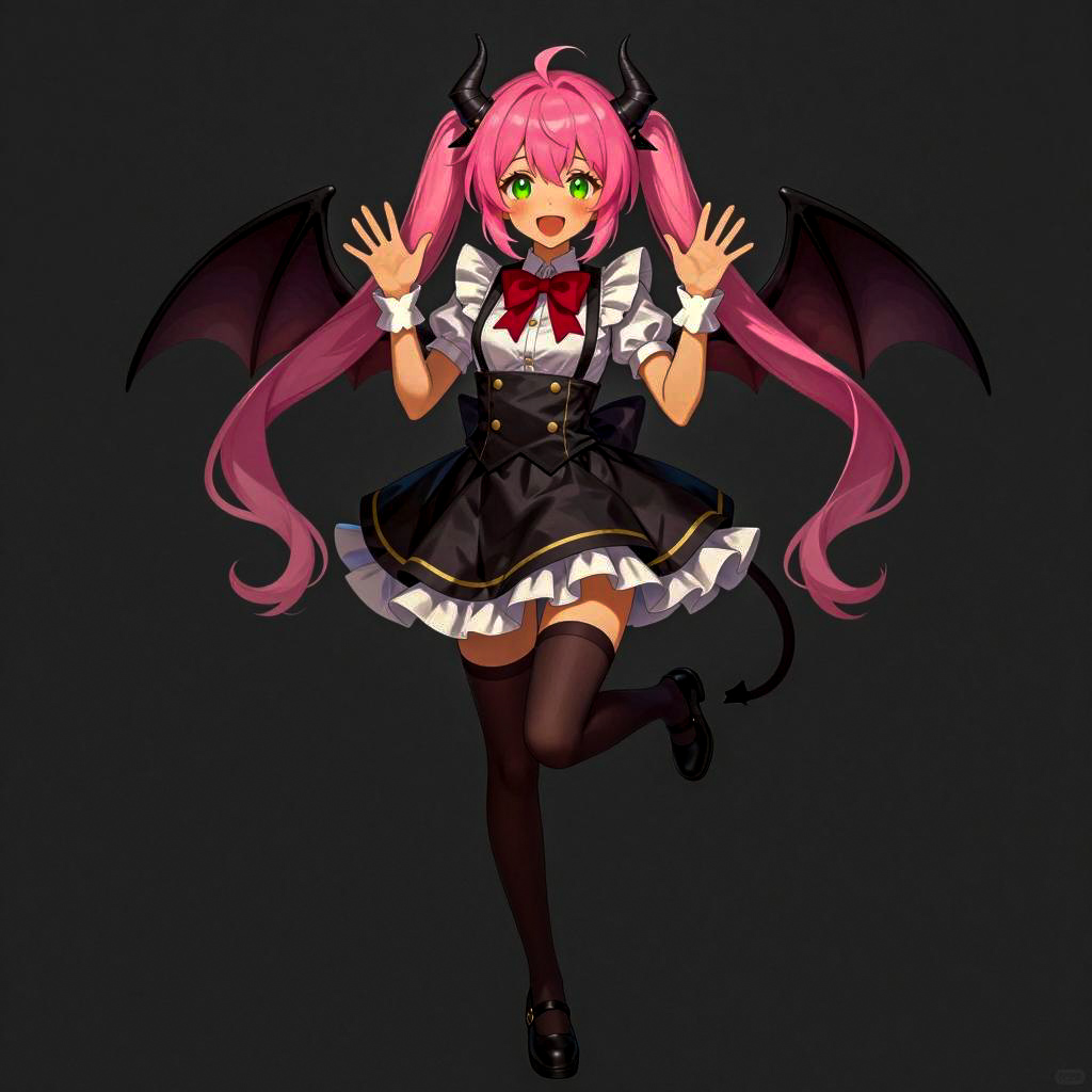 Digital anime-style illustration of a female demon girl with pink hair in twin tails, green eyes, and black horns. She wears a black vest, white frilled cuffs, red bowtie, black skirt, thigh-high stockings, and black shoes. Small bat wings and a pointed tail. Her right leg is raised, left hand up, right hand near her face, smiling with sharp teeth. Background is dark gray. Number of people: 1.
