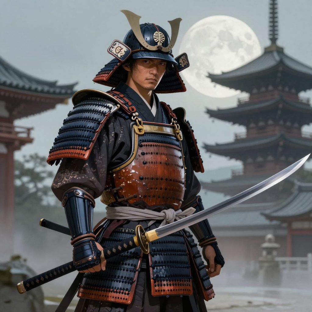 Digital artwork of a samurai warrior in detailed, dark blue armor with metallic accents, standing confidently amidst cherry blossom petals and a cloudy sky. He w