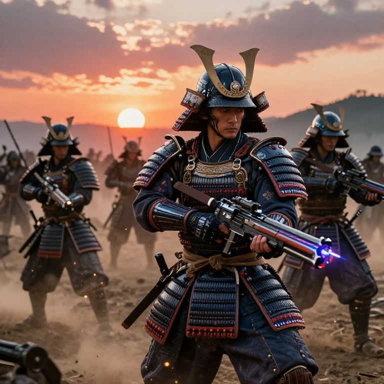 Samurai AI art depicting a traditional samurai blended with robotic elements, intricate armor having circuits and glowing blue lights, dynamic battle pose under a stormy sky, cherry blossoms falling, detailed and epic, high-resolution concept art