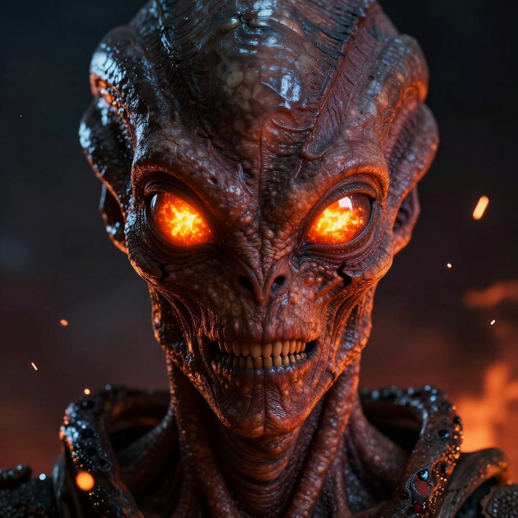 Close-up of a Pyra alien face with glowing ember eyes, cracked magma-like skin texture, intense expression, dark background with sparks of fire and ash, hyperrealistic style