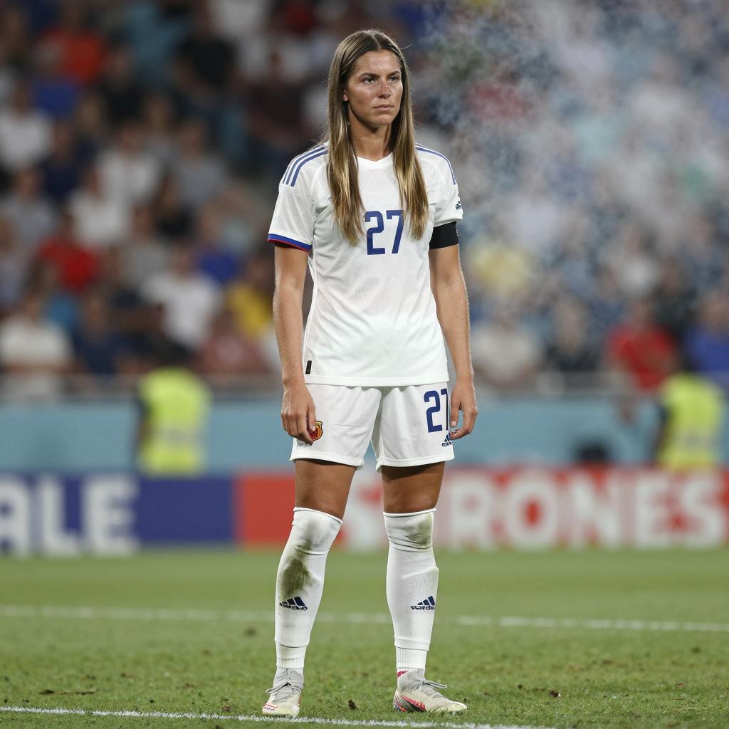 Brazil world cup dress, photorealistic, full body shot, young woman, standing, dark gray background, wearing yellow Brazilian soccer uniform, short sleeves, green trim, blue and green soccer ball graphic on chest, Brazilian flag patch on left chest, number 18 on right side, white sneakers, black hair in two buns, serious expression, studio lighting, realistic ures, modern digital art, subtle color noise, minimal shadows