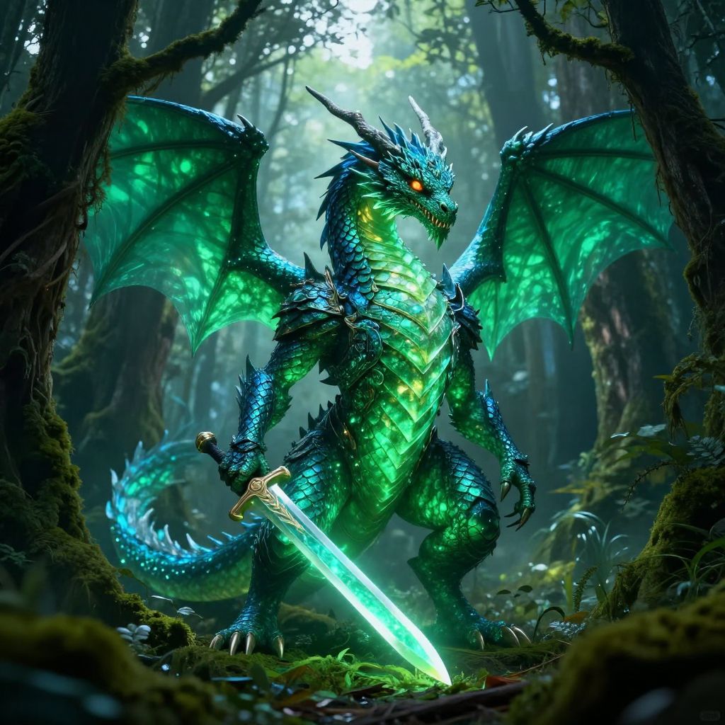 A majestic, mythical dragon covered in luminous green and blue scales, wielding a glowing sword, stands in an enchanted forest. The dragon features intricate armor-like scales with fiery orange eyes and is surrounded by dense moss-covered trees and soft ethereal light filtering through the canopy.