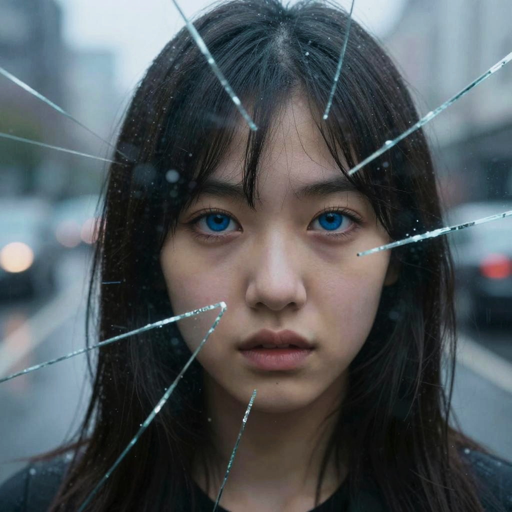 Close-up of a figure with jet black long hair, wet from rain, glistening under streetlights in a moody urban environment, cinematic lighting and high contrast.