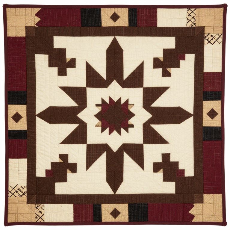 Vintage African American Folk Art Quilt featuring a geometric star pattern in cream and dark brown hues, bordered by intricate pieced blocks in maroon, beige, and black, showcasing traditional craftsmanship and cultural heritage.