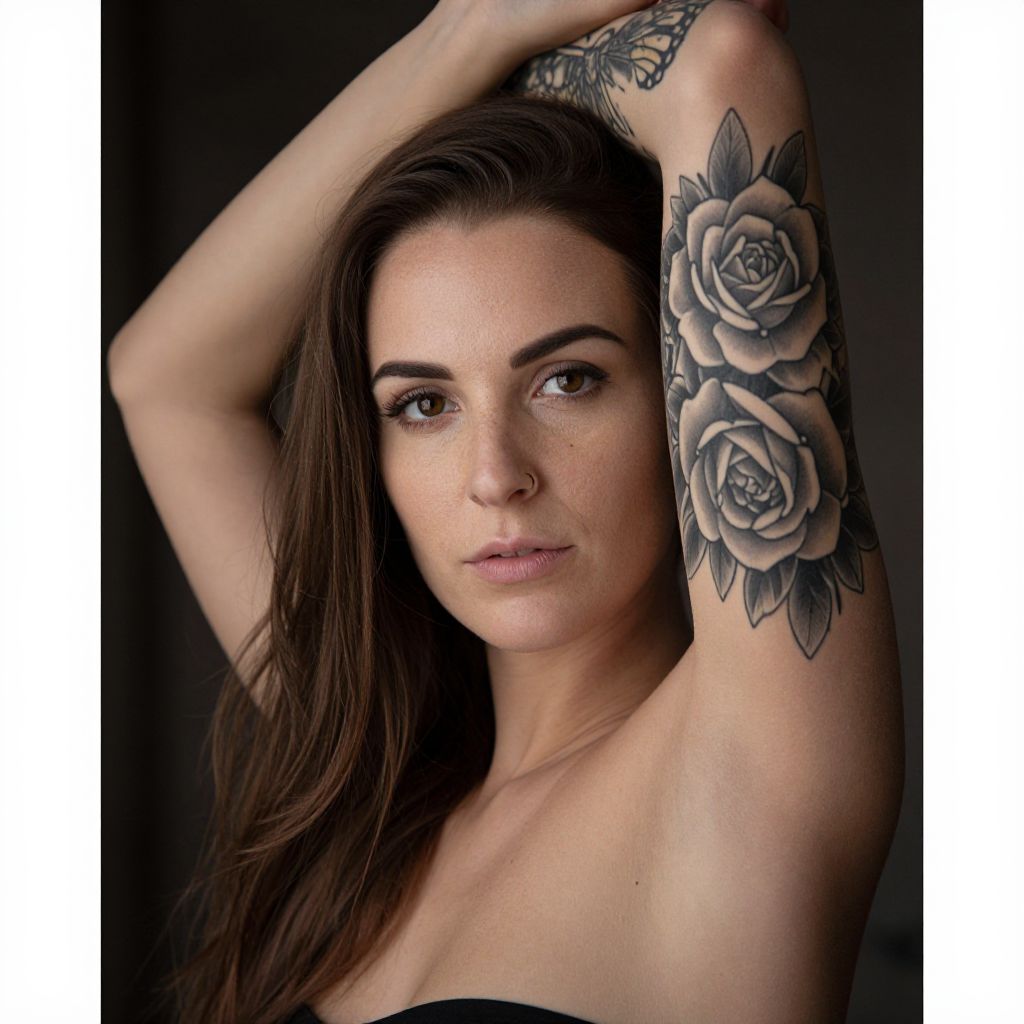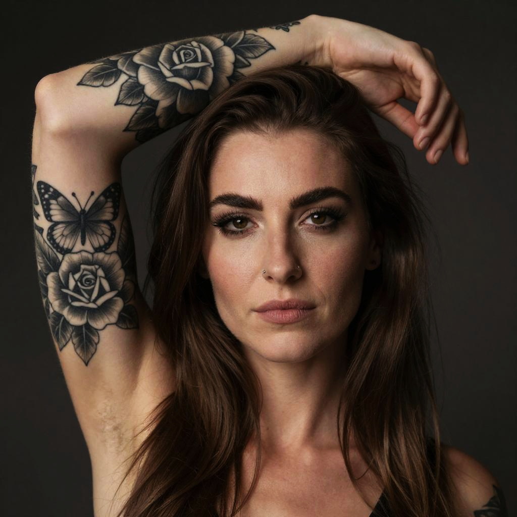 Photograph of a fair-skinned woman with long brown hair, gazing at the camera with a slight smirk. She has dark, defined eyebrows and a small nose piercing. Her right arm, which is raised above her head, is covered in a detailed black and gray tattoo of large roses and a butterfly. The background is dark and blurred, making her and her tattoos the focal point.