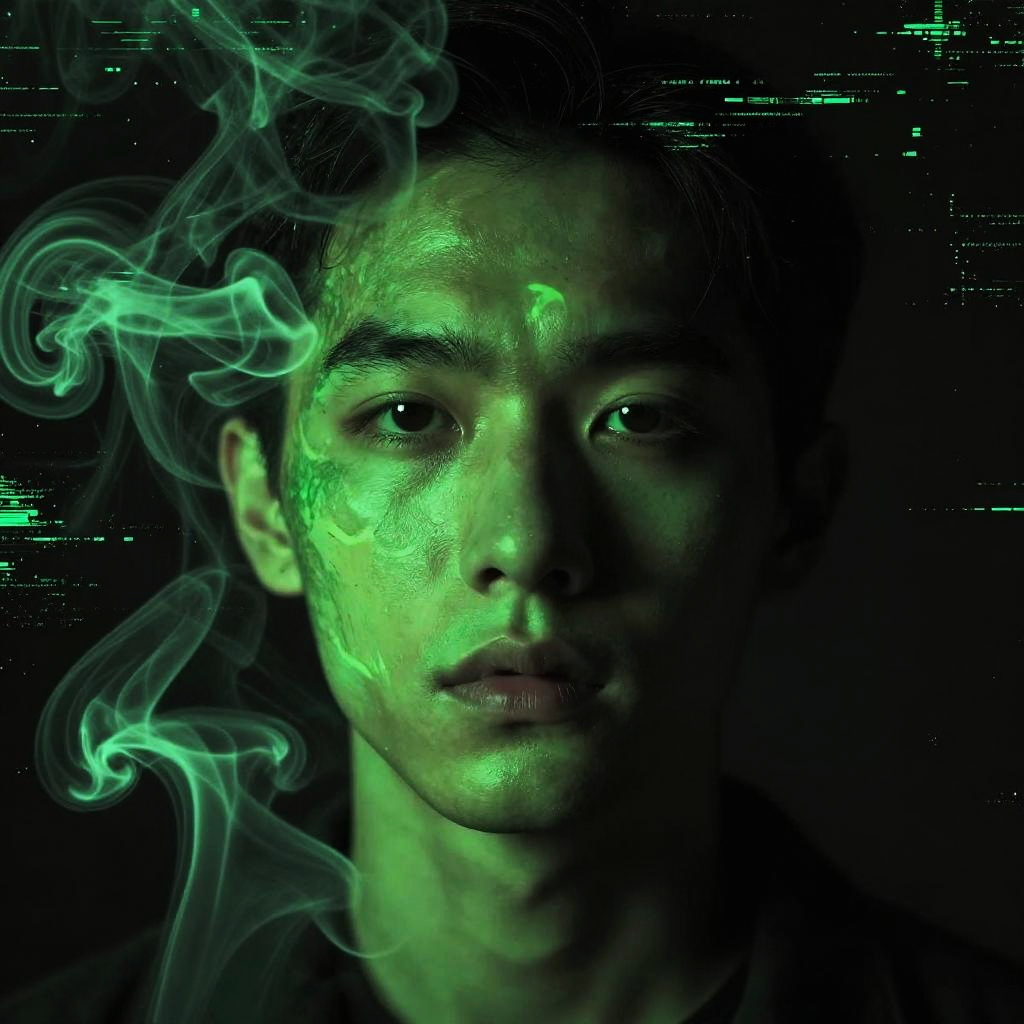 Phonk green abstract portrait, neon green highlights on face, smoke effects swirling around, mysterious and enigmatic expression, dark background with digital glitch textures