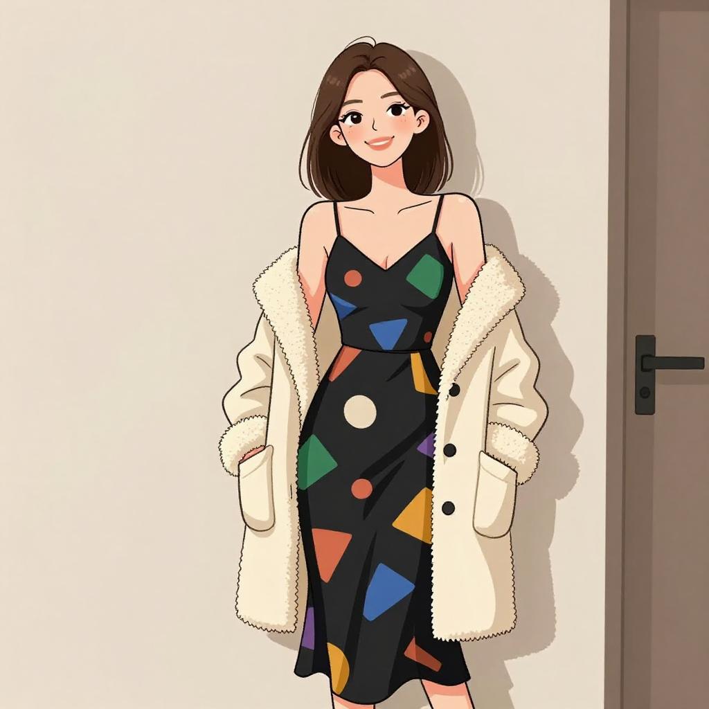 Woman with pretty face and pretty hair. smiling Woman, casual contemporary, black spaghetti strap dress with a pattern of colorful geometric shapes, V-neckline, midi length with a flowing hem, layered with an off-white shearling-lined coat with large pockets and button details, draped over the shoulders, indoor plain background. --sref 1467