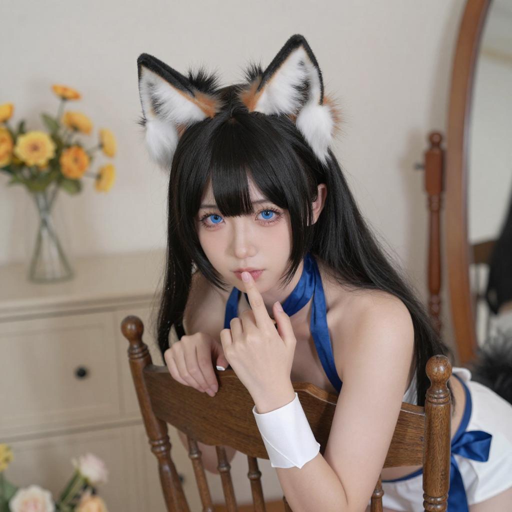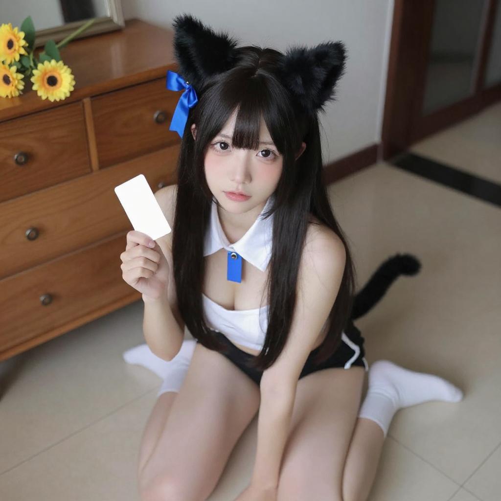 Photograph of a nude woman with black, wavy hair and cat ears, kneeling on a beige floor. She wears a blue headband and a white wrist cuff, with her right hand touching her chin. Her large eyes and pink lips are prominent. The background includes a wooden cabinet with yellow flowers on top and a white door.