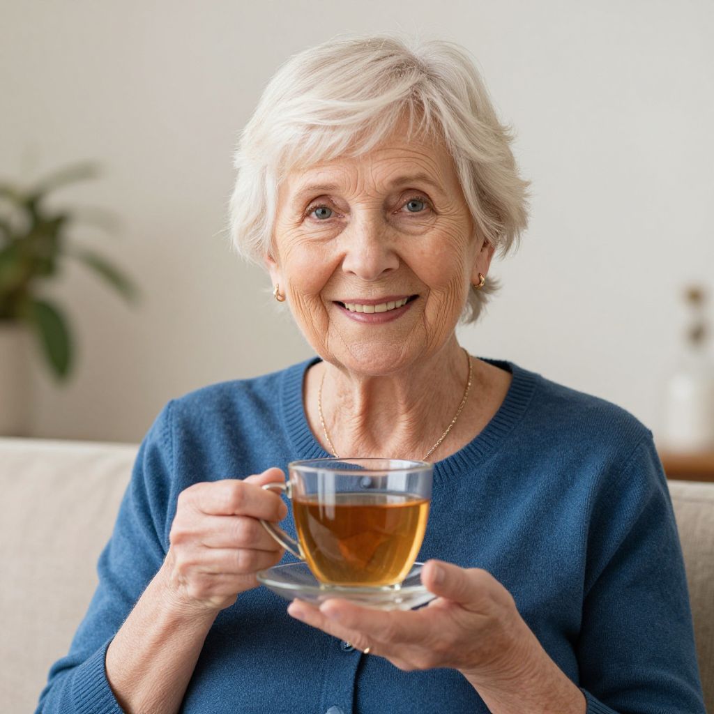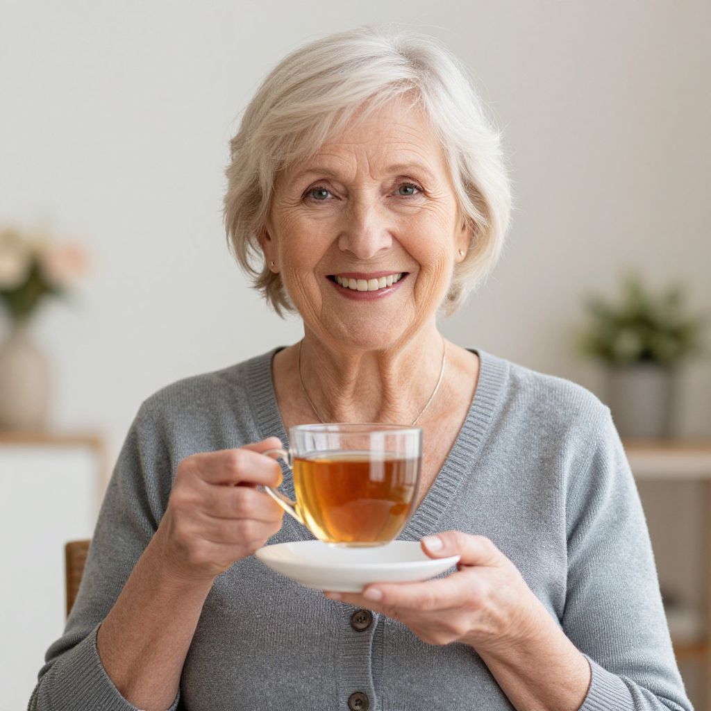 Smiling elderly woman with a cup of tea royalty free stock photo