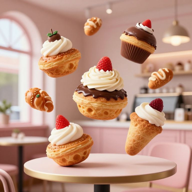 A vibrant CGI image depicts six whimsically floating pastries in a cozy café. The pastries, resembling waffles, cupcakes, and ice cream cones, feature toppings like chocolate drizzle, whipped cream, and fresh strawberries. They hover above a white round table in a softly lit, pink-themed café with blurred background elements including a window, potted plant, and kitchen counter. The pastries have realistic textures, from the waffle's grid pattern to the smooth chocolate and fluffy whipped cream. The scene is playful and colorful, with a warm, inviting atmosphere.