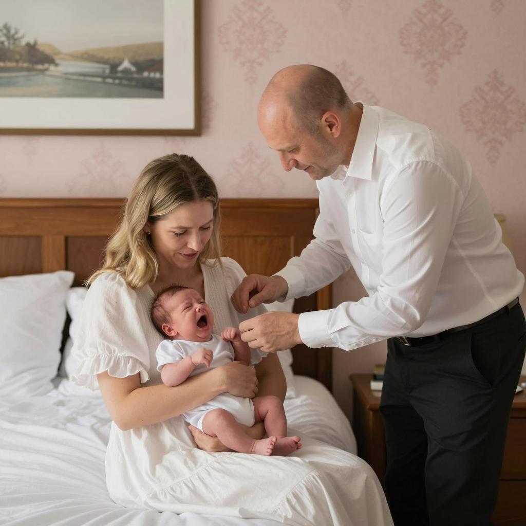 Photograph of a family. A dark-haired man in a blue-striped shirt sits on the left, smiling. A blonde woman with wavy hair, wearing a white dress, holds a baby wrapped in a white blanket, both smiling. The baby looks at the man. They are on a bed with a ured white wall in the background. The man and woman lean towards each other.