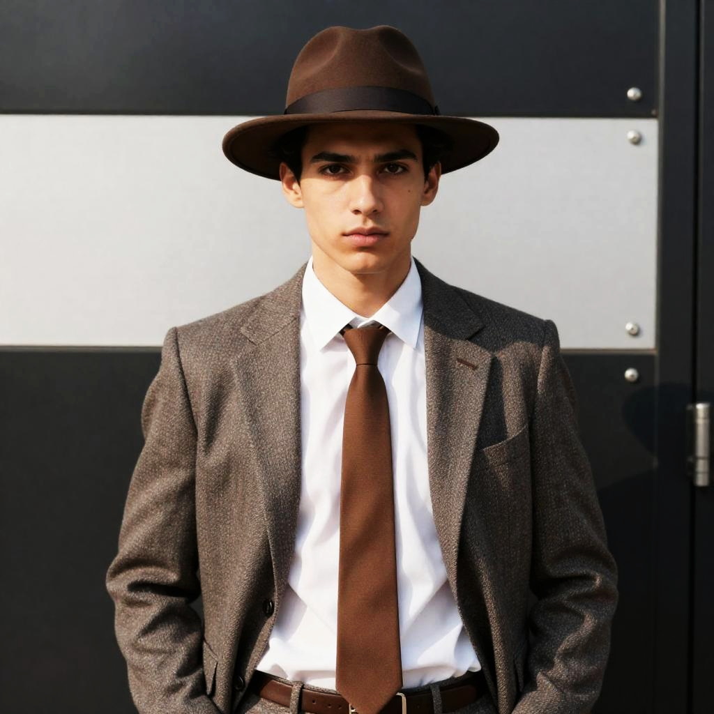 Photograph of a young man with light skin, dark hair, and intense gaze. He wears a brown fedora, gray tweed suit, white shirt, and brown tie. Background: metallic wall with white and black . He stands slightly turned to the right, hands in pockets. Sunlight casts shadows.