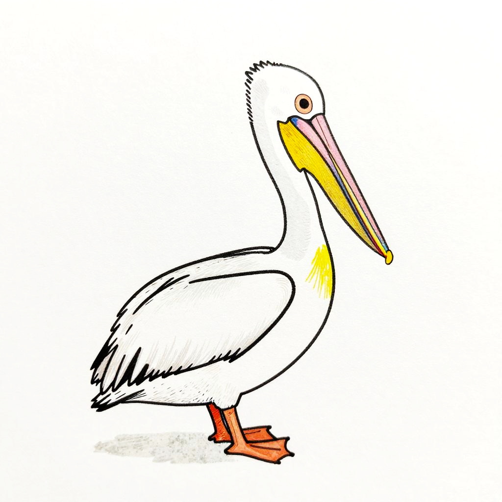 Landscape painting of a hand-drawn illustration of a pelican, in a minimalistic style with vibrant colors, minimalistic details on a white background, high quality.