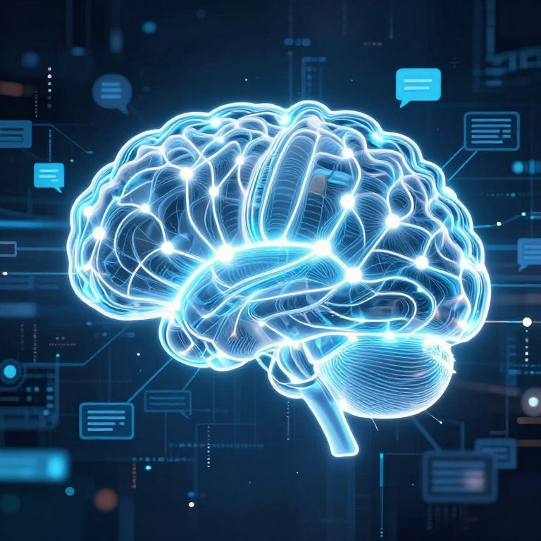 Chatgbt AI brain network visualization, glowing neural pathways intertwining with conversation icons and message threads, ethereal light blue and white color scheme, cybernetic cyberpunk theme, complex data visualization with futuristic textures and depth