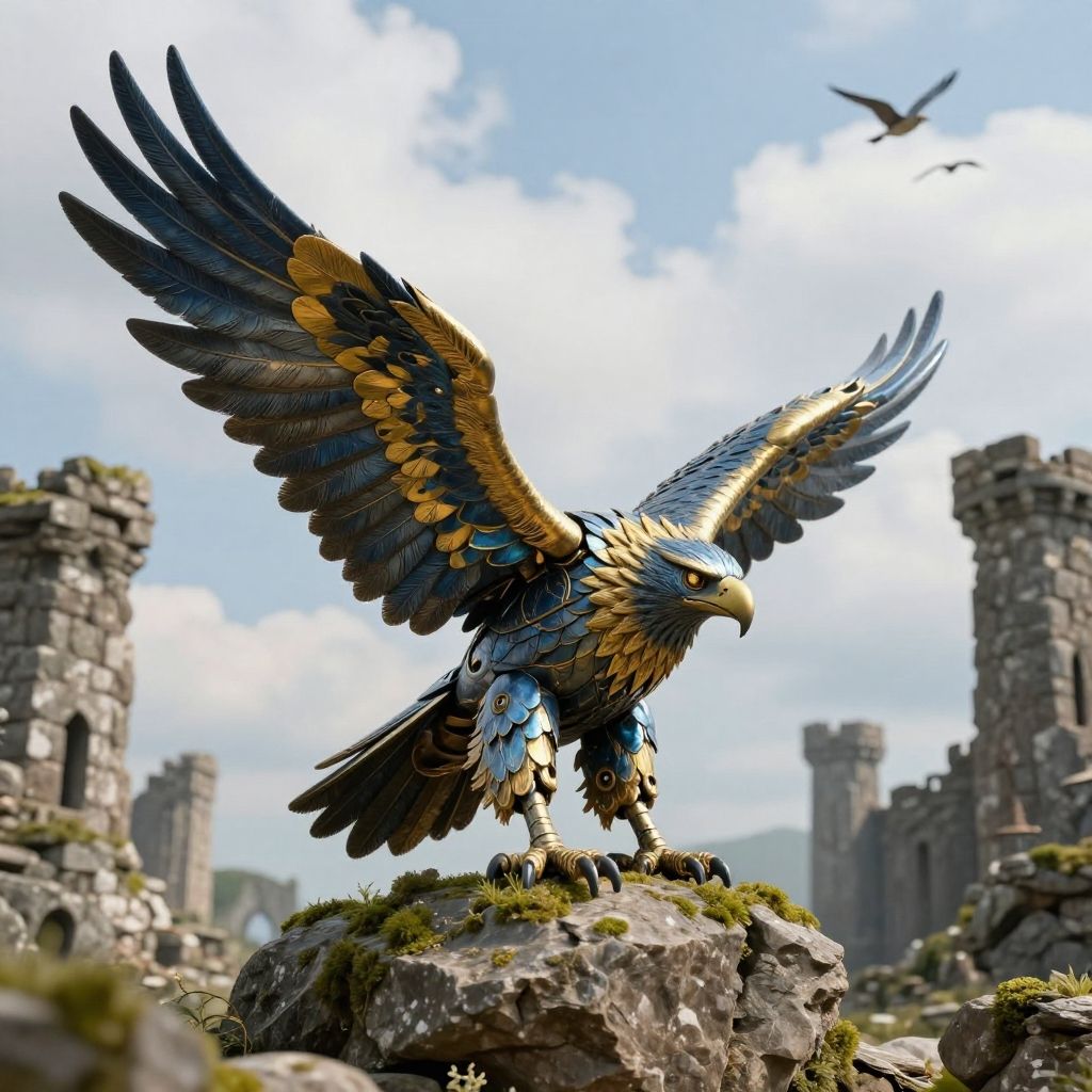 A detailed mechanical eagle sculpture with metallic blue and gold feathers, perched on a mossy rock amid ancient stone ruins and tall towers. The background features a partly cloudy sky and flying birds, enhancing the fantasy atmosphere.
