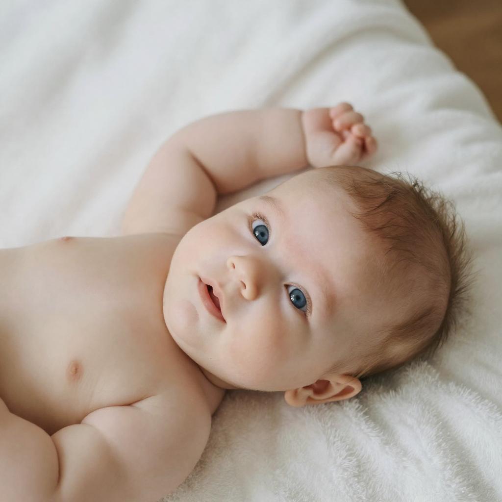 Photograph of a baby's feet, centered and close-up, with soft, pinkish skin and tiny toes. The baby is lying on a fluffy, cream-colored blanket, creating a cozy background. The camera angle is low and slightly tilted, capturing the soles prominently. Lighting is warm and even, highlighting the baby's smooth skin. The depth of field is shallow, with the background blurred, keeping focus on the baby's feet.