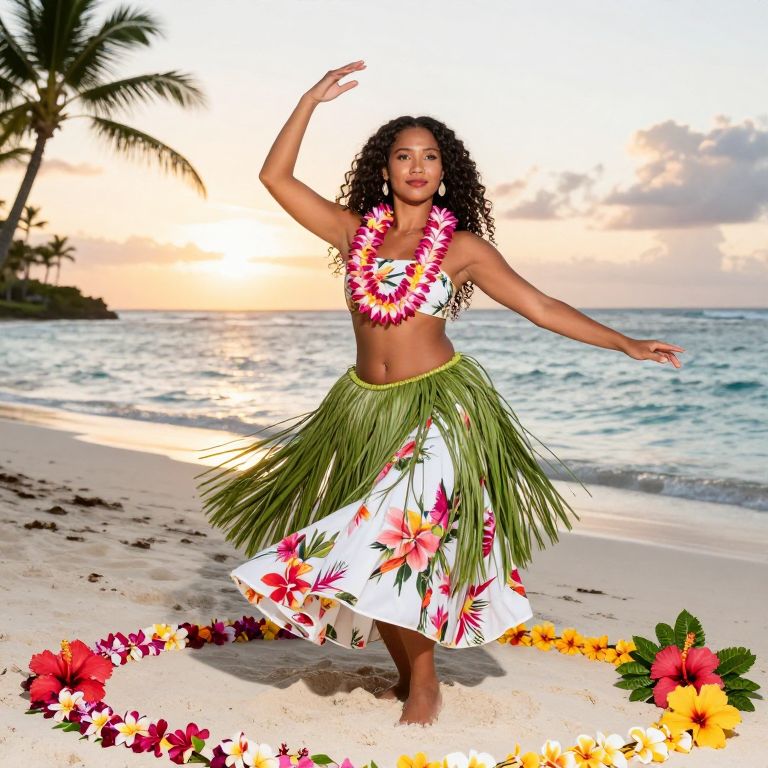 A vibrant Hawaiian hula girl with smooth, sun-kissed skin, bright brown eyes, and natural curly hair wearing a traditional grass skirt and a flowy white floral dress, dancing gracefully on a pristine white sandy beach at sunset, surrounded by colorful lei flowers made of plumeria and hibiscus, with gentle ocean waves in the background and palm trees swaying in the breeze