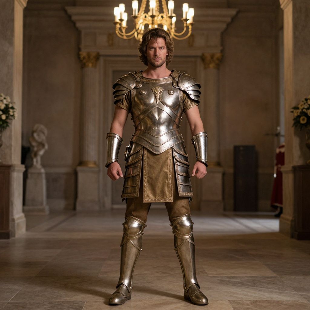 Apollo costume, man in armor standing in a hall with a chandelier