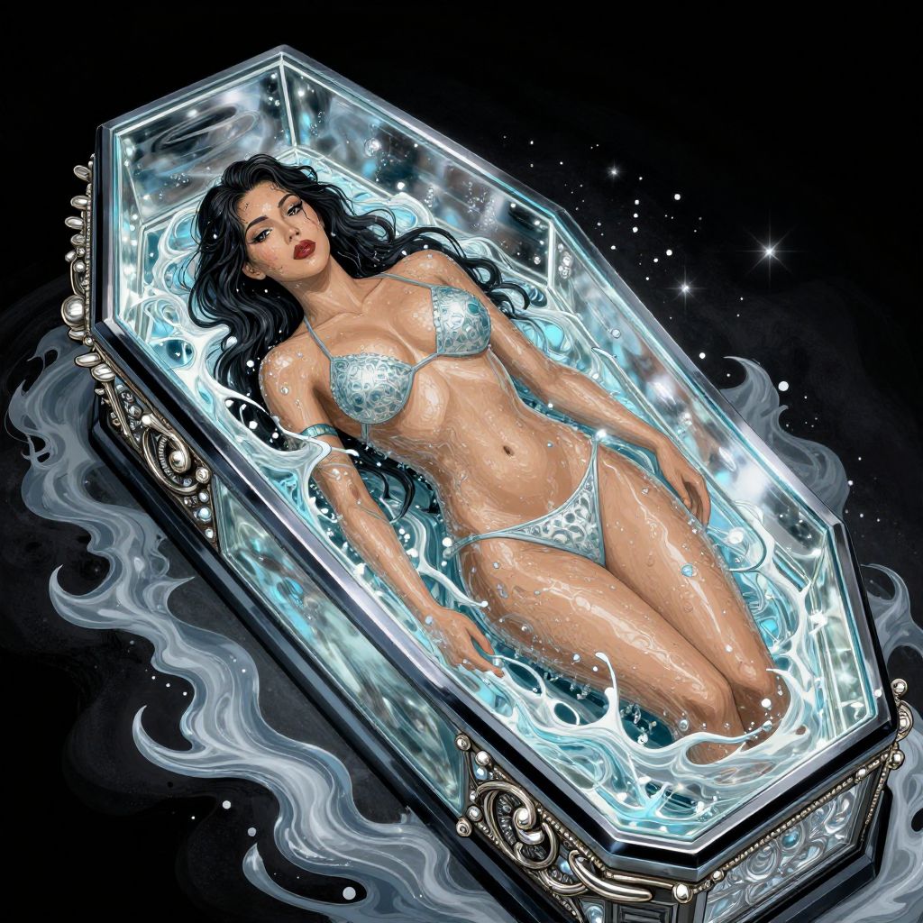 Digital artwork of a dark-haired woman with fair skin, lying in a glowing, crystal-like coffin filled with water. She wears a white, gem-encrusted bikini that highlights her curvy, voluptuous physique and large breasts. Her red lips and dark, smoky eye makeup contrast with her serene expression. The coffin, adorned with intricate silver patterns, floats in a dark, starry background, with swirling, ethereal water patterns surrounding it. The overall style is highly detailed and reminiscent of comic book art, with a focus on vibrant colors and dramatic lighting.