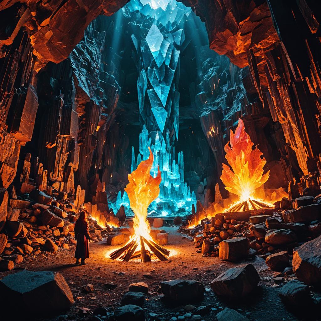 Vivid image of an elemental spirit manipulating fire within a large crystal cavern. The scene features glowing orange flames contrasting with towering blue crystal formations. The cavern is filled with ancient artifacts and modern technology scattered among rocky terrain. A lone figure cloaked in red stands near the fiery bonfires, enhancing the mystical atmosphere.