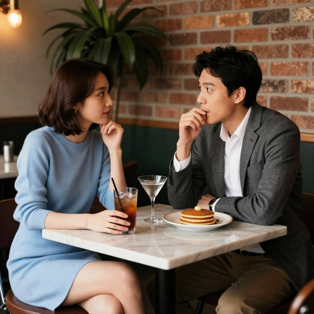 Photograph of a woman and man sitting on a wooden counter. Woman with long brown hair in pink sleeveless top, facing man. Man with dark hair in green jacket, blue shirt, facing woman. Overhead green lamp. Background with curtains, wooden beams, and shelves. Woman smiling, man smiling slightly. Clear plastic bowl with fruit on counter.