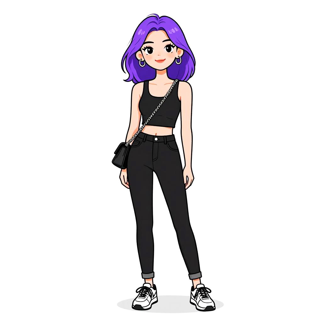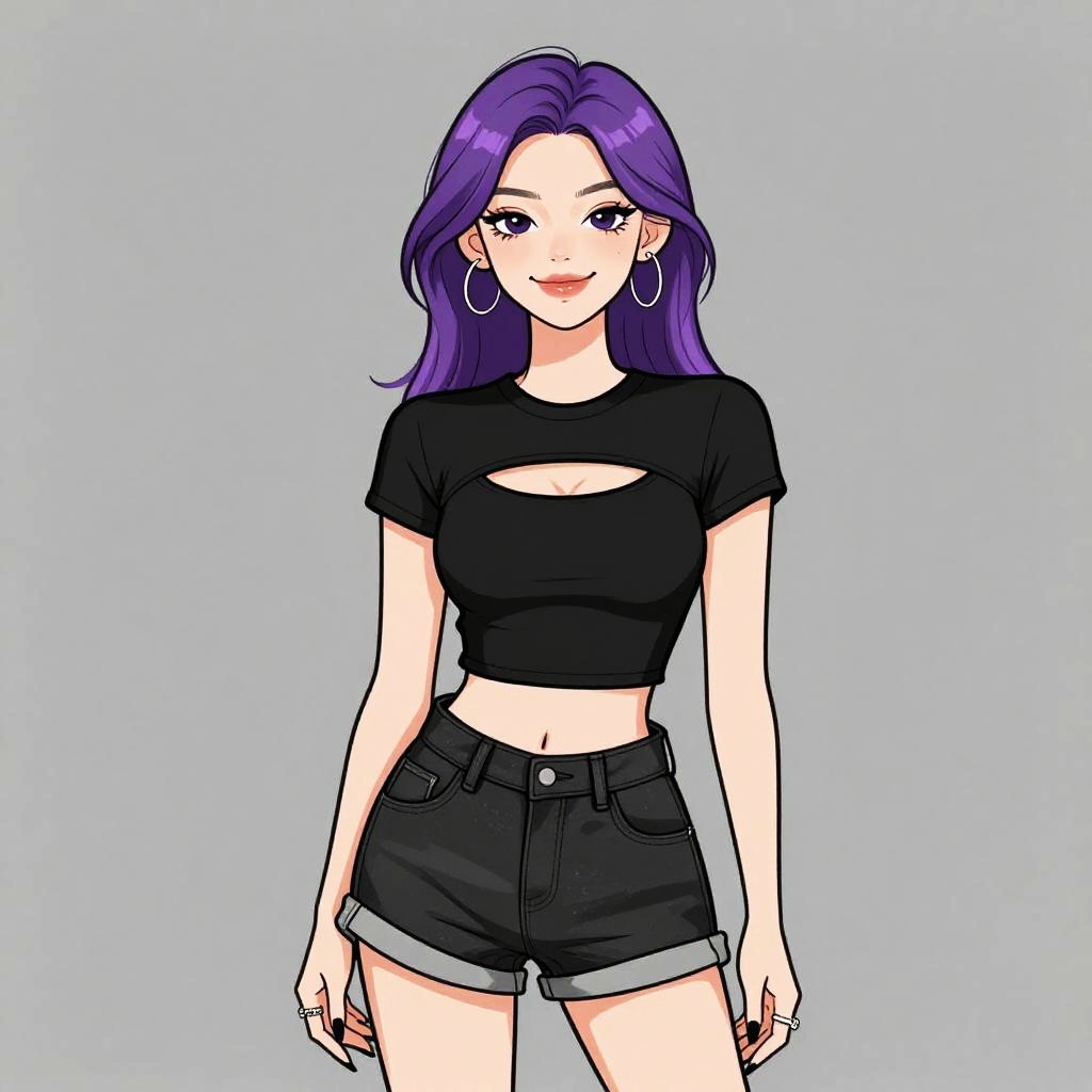 Woman with pretty face and pretty hair. Woman, casual streetwear, heathered charcoal t-shirt, relaxed fit, black denim cutoff shorts with frayed hems, thin black belt with silver buckle, rings on fingers, messy wavy hair, plain white background. --sref 1467
