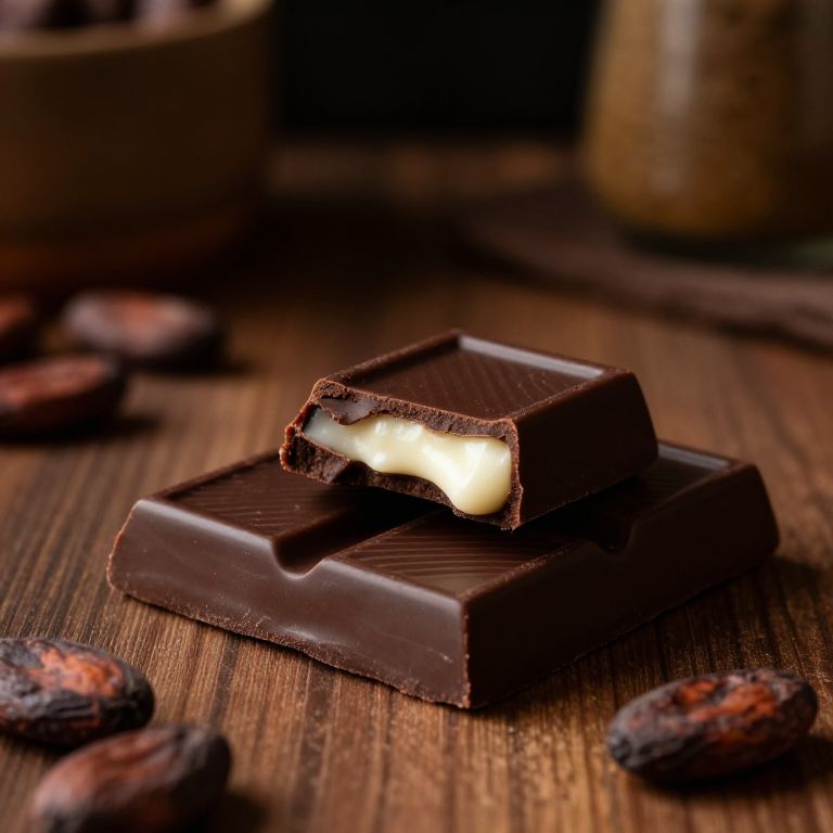 Still life of dunkelbraune chocolate bars with melting edges on a wooden surface, surrounded by cocoa beans and rustic kitchen items, moody lighting emphasizes rich brown tones and creamy textures