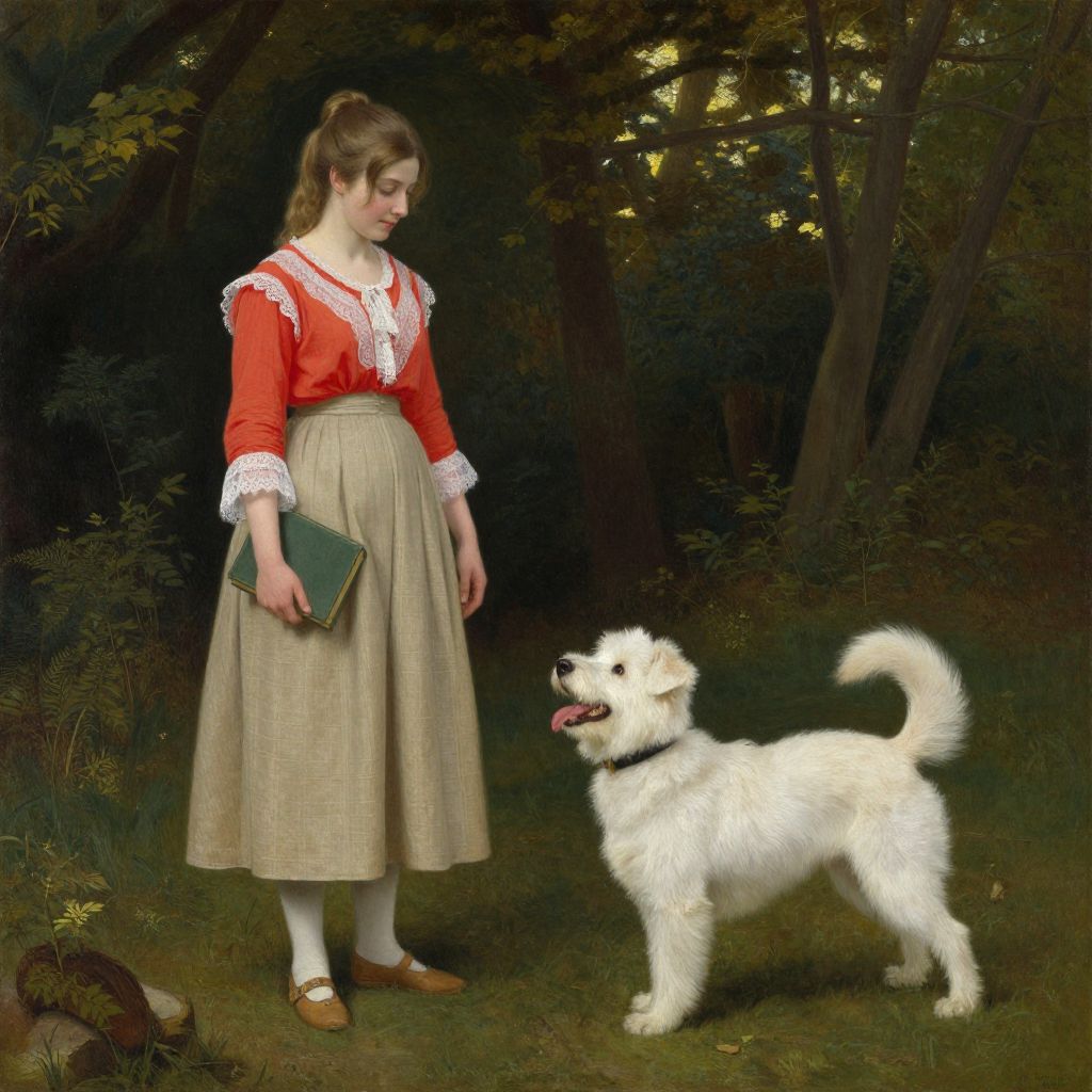Arthur Wardle's painting depicts a serene outdoor scene where a young woman stands gracefully to the left, dressed in a red blouse with white lace trim and a beige skirt, holding a green book, while a lively white dog with a black collar bounds joyfully to her right, its tongue out and tail raised, set against a lush backdrop of trees and dappled sunlight.