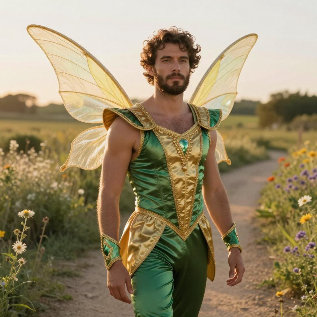 Photorealistic outdoor portrait of a man wearing an elaborate green and gold fairy costume with large translucent yellow wings. The image is taken during golden hour, with warm sunlight illuminating the scene. The man has curly hair and a well-groomed beard, standing on a nature trail surrounded by wildflowers and greenery.
