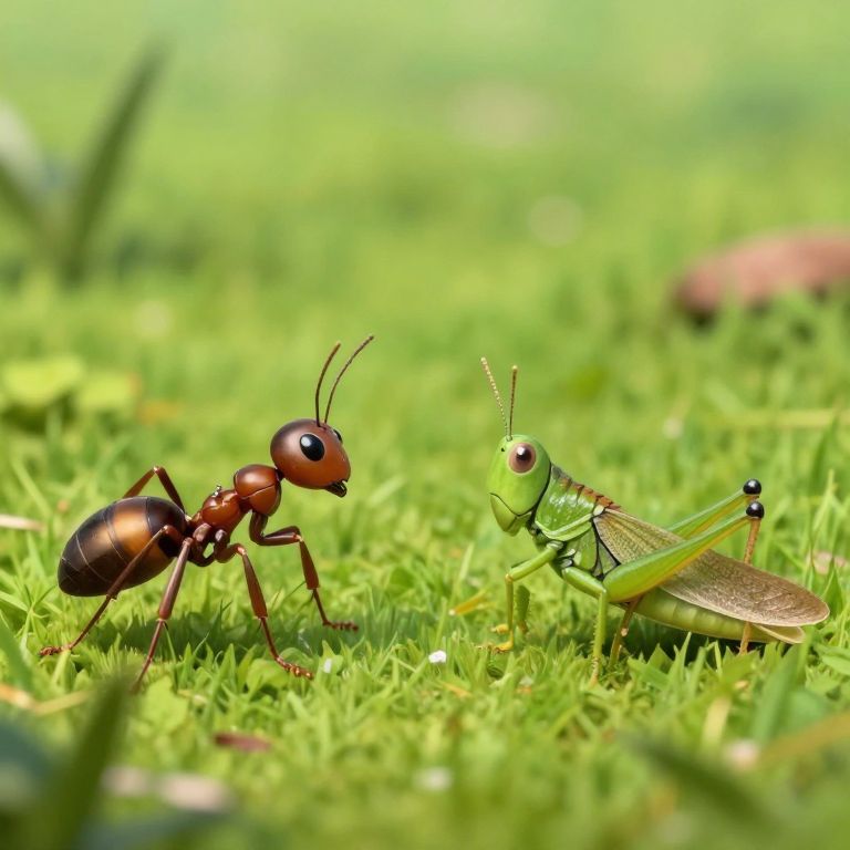 Two anthropomorphic insects, a brown ant and a green grasshopper, stand facing each other amidst a patch of grass, embodying the classic tale of \"The Ant and the Grasshopper\" from Aesop's Fables.