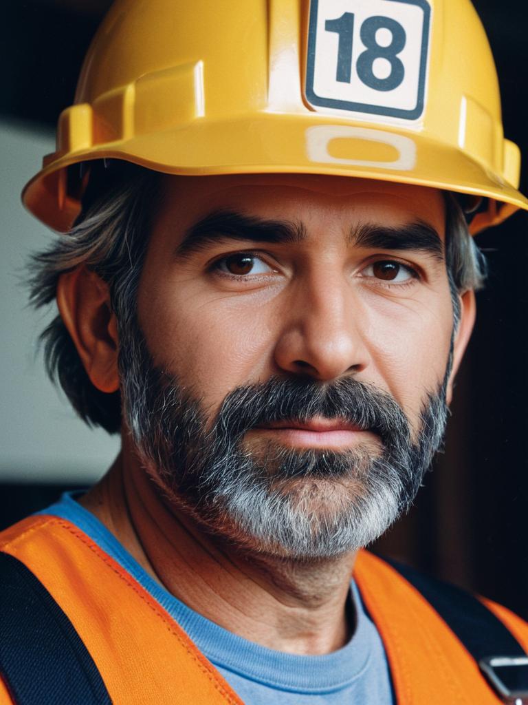 Close-up detailed headshot of a middle-aged man wearing a yellow hard hat with a TB logo, orange shirt, and blue overalls, resembling the Bob the Builder character. The man has a salt-and-pepper beard and dark eyes with a neutral expression, set against a plain dark background.