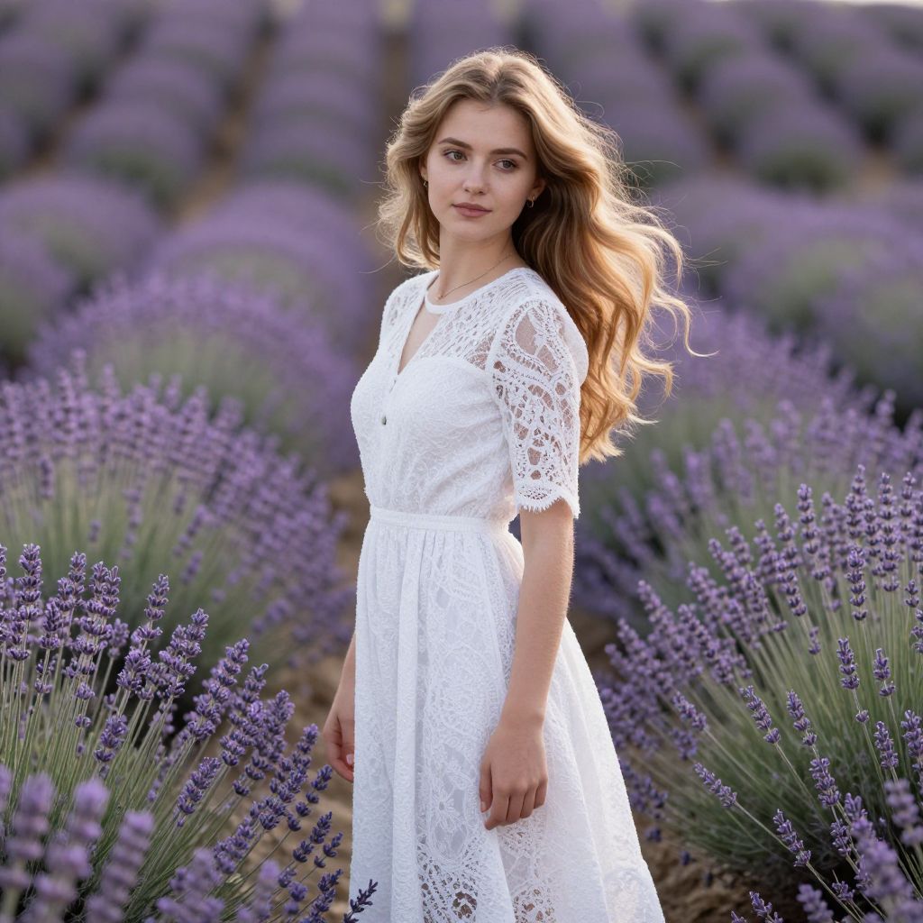 Photograph of a young Caucasian woman with long, wavy light brown hair standing in a lavender field. She has fair skin and is wearing a white, lace, short-sleeved dress with a V-neck and flowing skirt. The lavender flowers around her are in full bloom, with vibrant purple hues and green stems. The background is a blur of more lavender plants, creating a sense of depth. The woman's expression is calm, and she stands with her right hand gently resting by her side. The sunlight casts a soft glow on her hair and dress, enhancing the serene and picturesque scene.