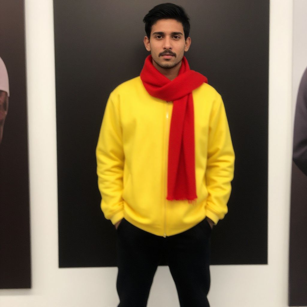 Photograph of a young man with medium brown skin and short, curly black hair and a small mustache. He is wearing a bright yellow, oversized sweater with red hands in the pockets, and a large red scarf around his neck. He has black pants on. The background is a stark black rectangle with white edges, creating a strong contrast. The lighting is even, highlighting his casual yet stylish outfit. His expression is neutral, and he stands centered in the frame, looking directly at the camera.
